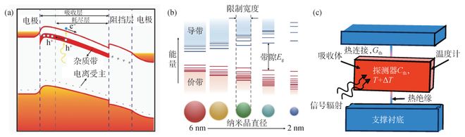 图3传统探测器的能带结构及器件结构 (a)阻挡杂质带探测器的能带结构;(b)量子点探测器的能带示意图,由于量子限域效应的存在,量子点的空间尺寸大小直接影响能带带隙的大小;(c)热探测器结构示意图