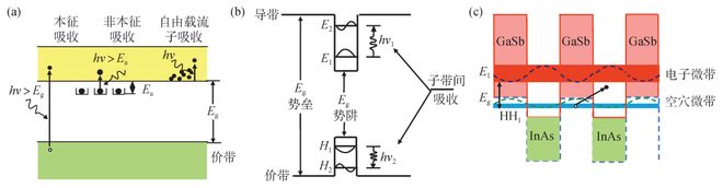 图2传统探测器的能带示意图和光吸收过程[2] (a)HgCdTe半导体材料探测器的能带示意图;(b)GaAs/AlGaAs量子阱探测器的能带示意图;(c)InAs/GaSbⅡ型超晶格探测器的能带示意图