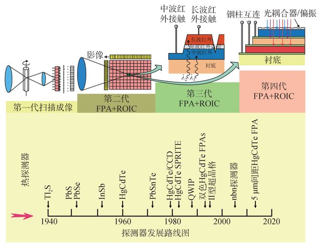 图1红外探测器的发展历史[2]。红外探测器经历了由单点扫描成像向大规模成像探测器件的发展,可大致分为四代,图中给出了每代探测器的典型特征和红外探测器发展中的重要里程碑节点