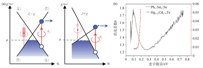 代表外尔锥的手性)的定向电流。在右图倾斜的外尔锥中,产生的定向电流由于光激发过程的泡利跃迁禁戒作用,并不严格与外尔锥的手性相关,因而体系中两相反手性外尔锥中产生的光电流并不完全抵消,体系具有非零的净电流;(b)拓扑绝缘体Pb 0.7 Sn0.3Se与传统红外探测材料HgCdTe的光吸收系数对比。由于Pb0.7Sn0.3Se存在能带反转导致的高光学跃迁矩阵元,以及墨西哥帽型能带结构导致的高联合态密度,其带边吸收系数是传统红外探测材料HgCdTe的10倍以上