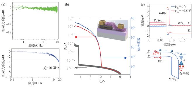 V曲线,蓝线为相应的倍增系数,右上插图为结构示意图;(c)利用多子阻挡层降低二维材料异质结红外探测器暗电流噪声的原理示意。上图为范德瓦耳斯单极势垒结构能带示意图,通过在n型器件中引入电子阻挡层,或者在p型器件中引入空穴阻挡层,可以降低器件的暗电流。在下图所示的p型器件中,蓝色小球代表导带中的电子,红色小球代表价带中的空穴,箭头方向代表电子/空穴的运动方向,由于造成暗电流的石墨烯空穴被空穴势垒层阻挡,从而显著抑制了器件暗电流