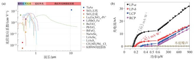 图5基于拓扑材料红外光电探测的研究进展[10,11] (a)外尔半金属TaAs与已知铁电材料的光伏效应系数对比。由于拓扑效应,TaAs的体光伏效应系数远强于其他已知的铁电材料;(b)外尔半金属TaIrTe4中的光电流响应强度与激发光强度的依赖关系,其斜率代表器件响应度,其中LP-